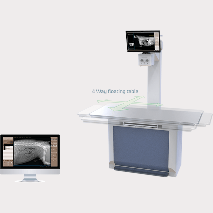 El X500, con un pequeño espacio de trabajo, una mesa flotante de 4 vías y un detector de pantalla plana de yoduro de cesio de 17 x 17 pulgadas, proporciona al veterinario un potente sistema de rayos X digital para todas sus necesidades de imágenes.